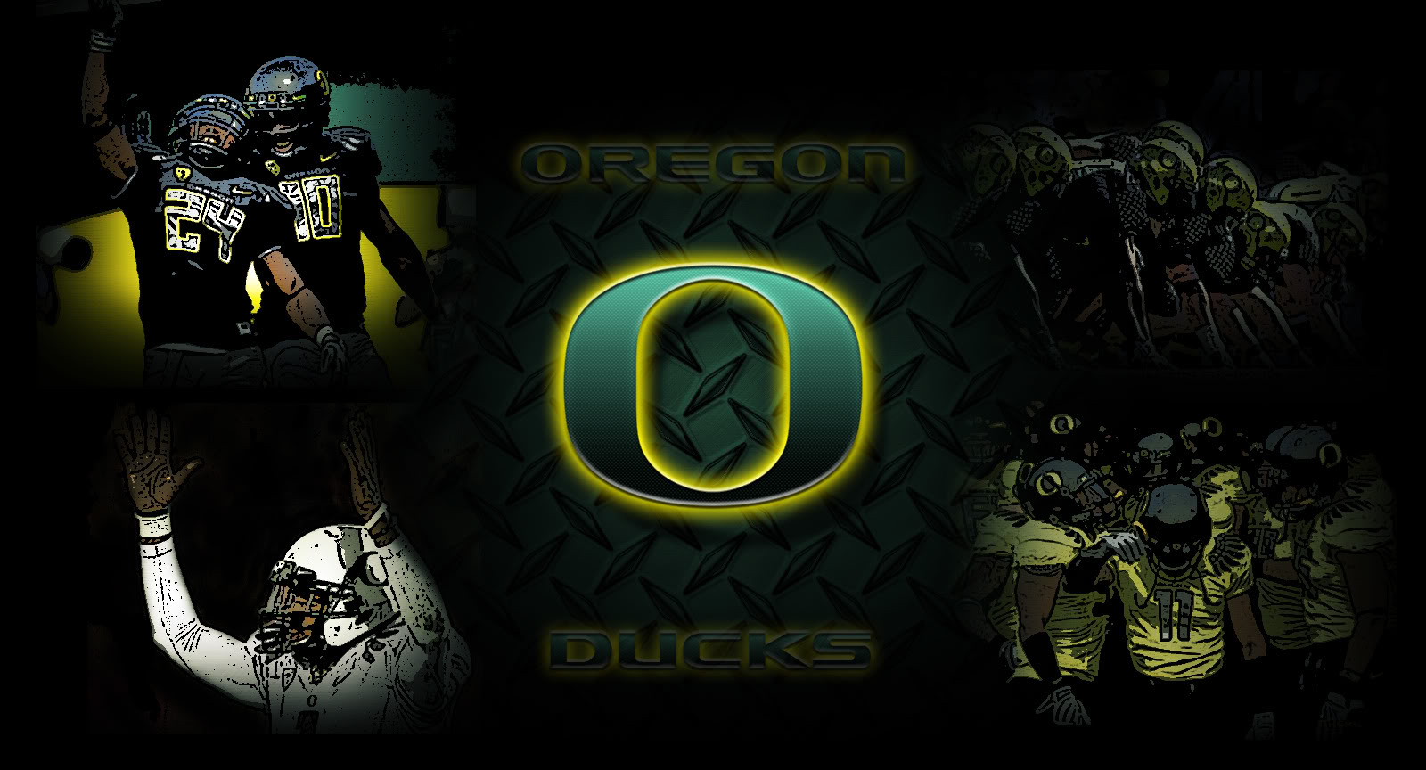 Description: A group of people standing around each other in front of a wall with a oregon ducks logo on it.