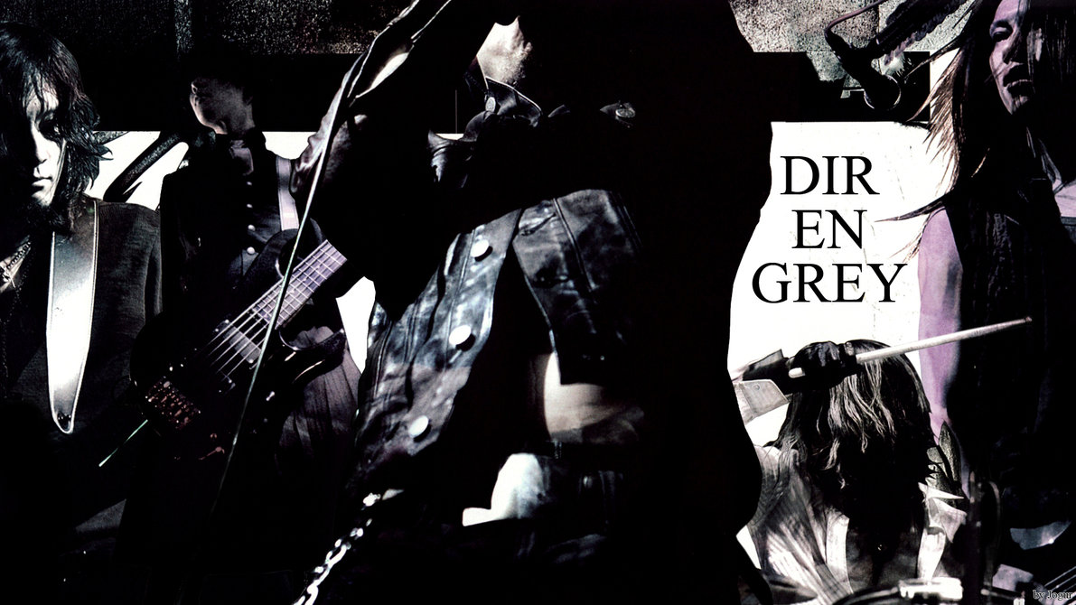 Description: A group of people with guitars and a sign in the background that says dir en grey on it and a man with a hat on his head.