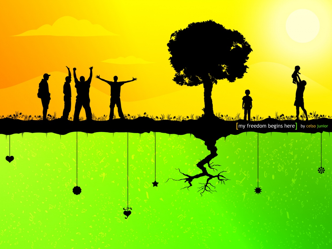 Description: A group of people standing on a hill with a tree in the background and a sunset in the background.