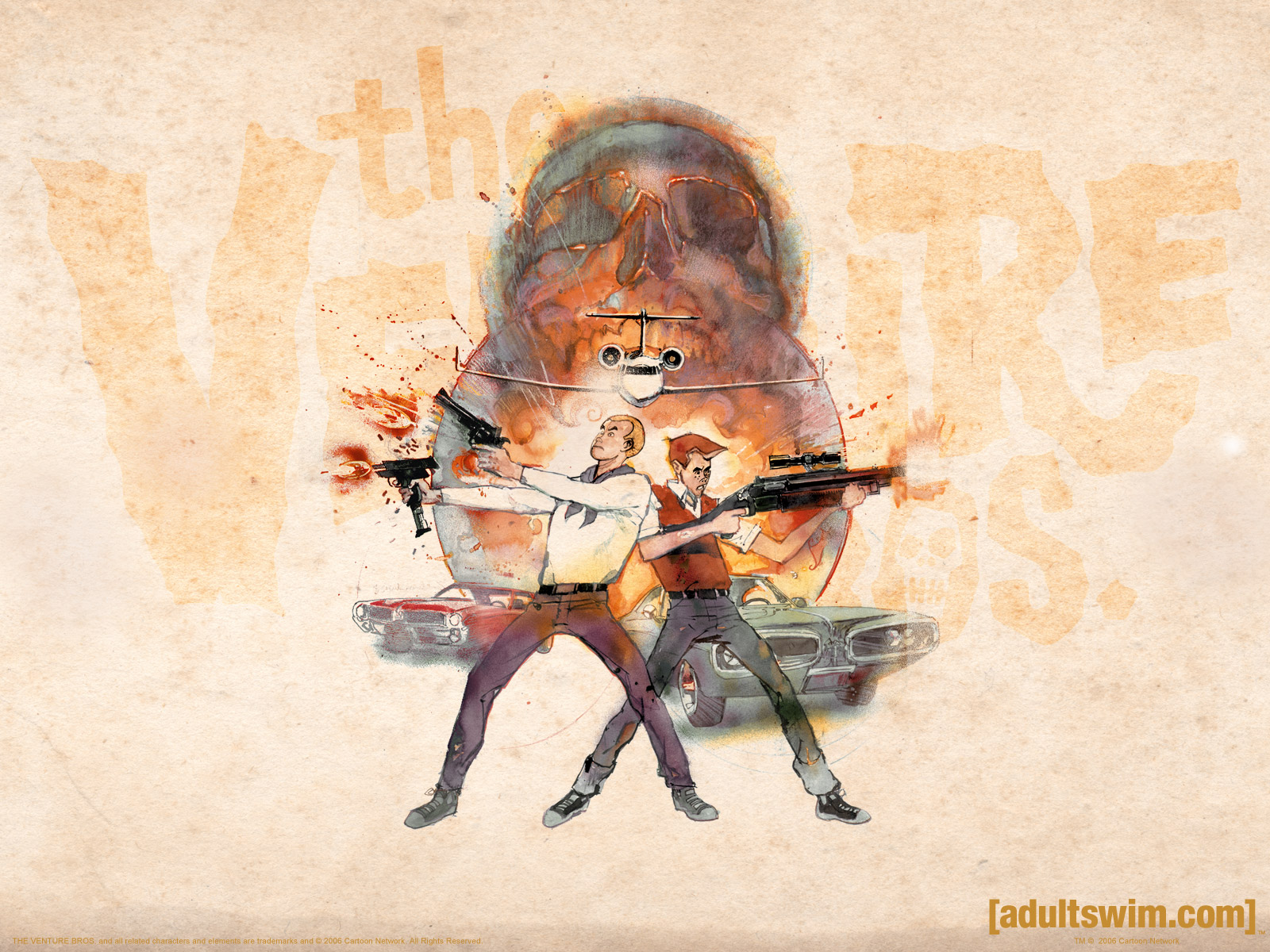 Description: A painting of two people holding guns in front of a giant object with a man holding a gun in the other hand.