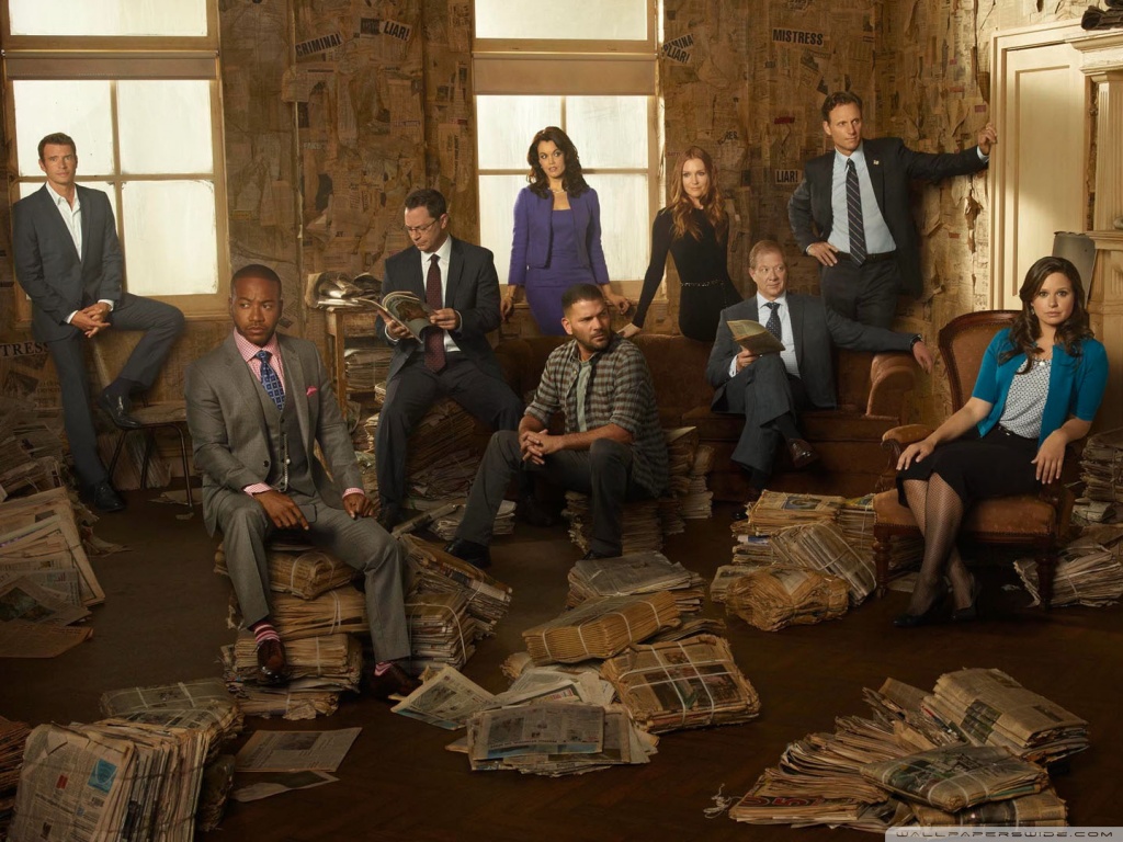 Description: A group of people sitting around a pile of newspapers in a room with windows and a door in the background.