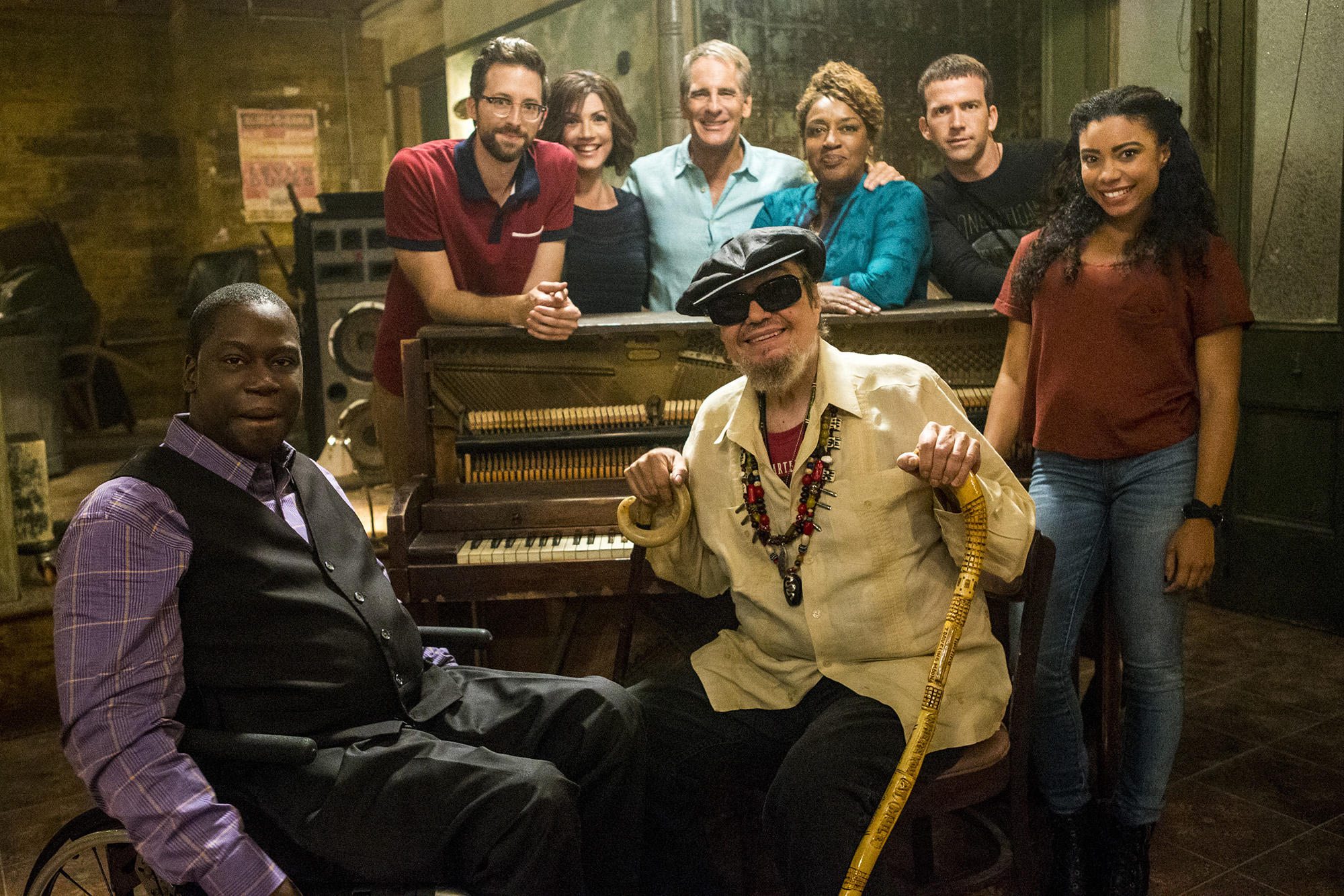 Description: A group of people standing around a piano in a room with a man in a wheelchair and a woman in a hat.
