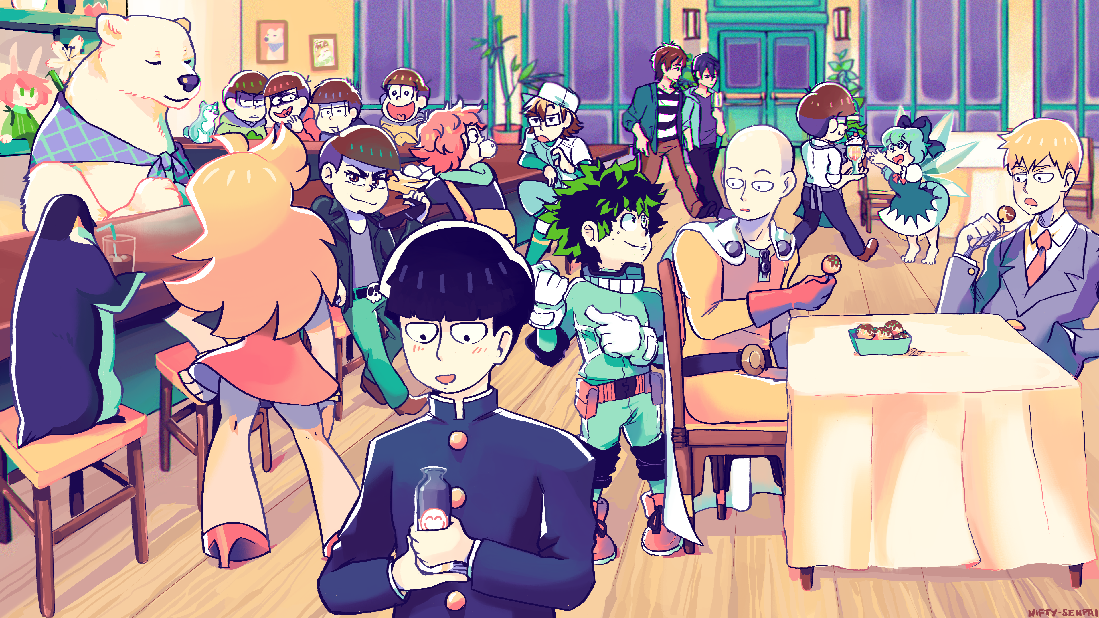 Description: A group of people in a room with a table and chairs and a cat on the table and a woman holding a cell phone.
