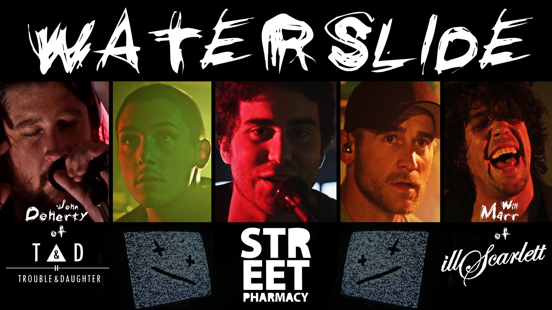 Description: A poster with a bunch of different people singing and talking on the phone and the words water slide written in white.