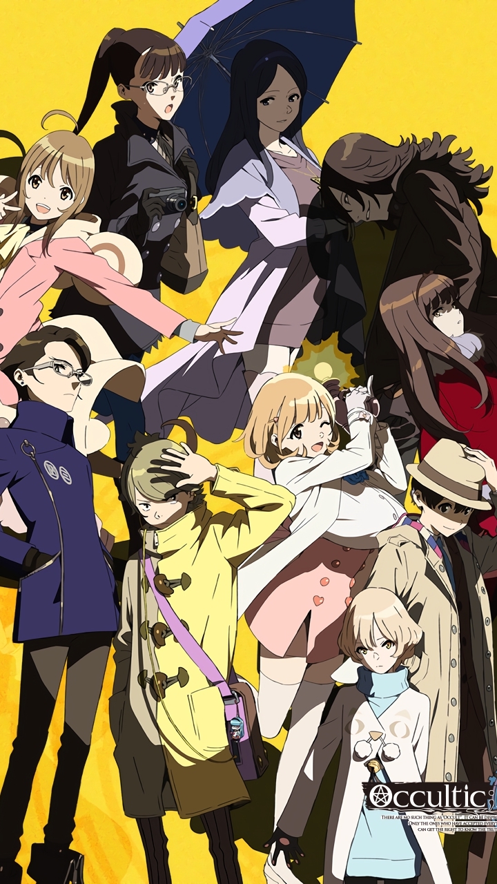 Description: A group of people standing next to each other with an umbrella over their heads and a yellow background behind them.