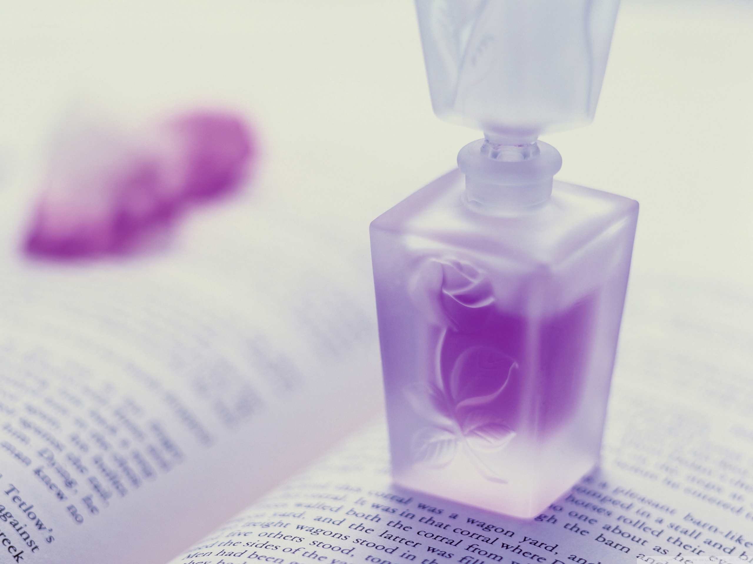 Description: A bottle of perfume sitting on top of an open book with a flower in it's top corner.