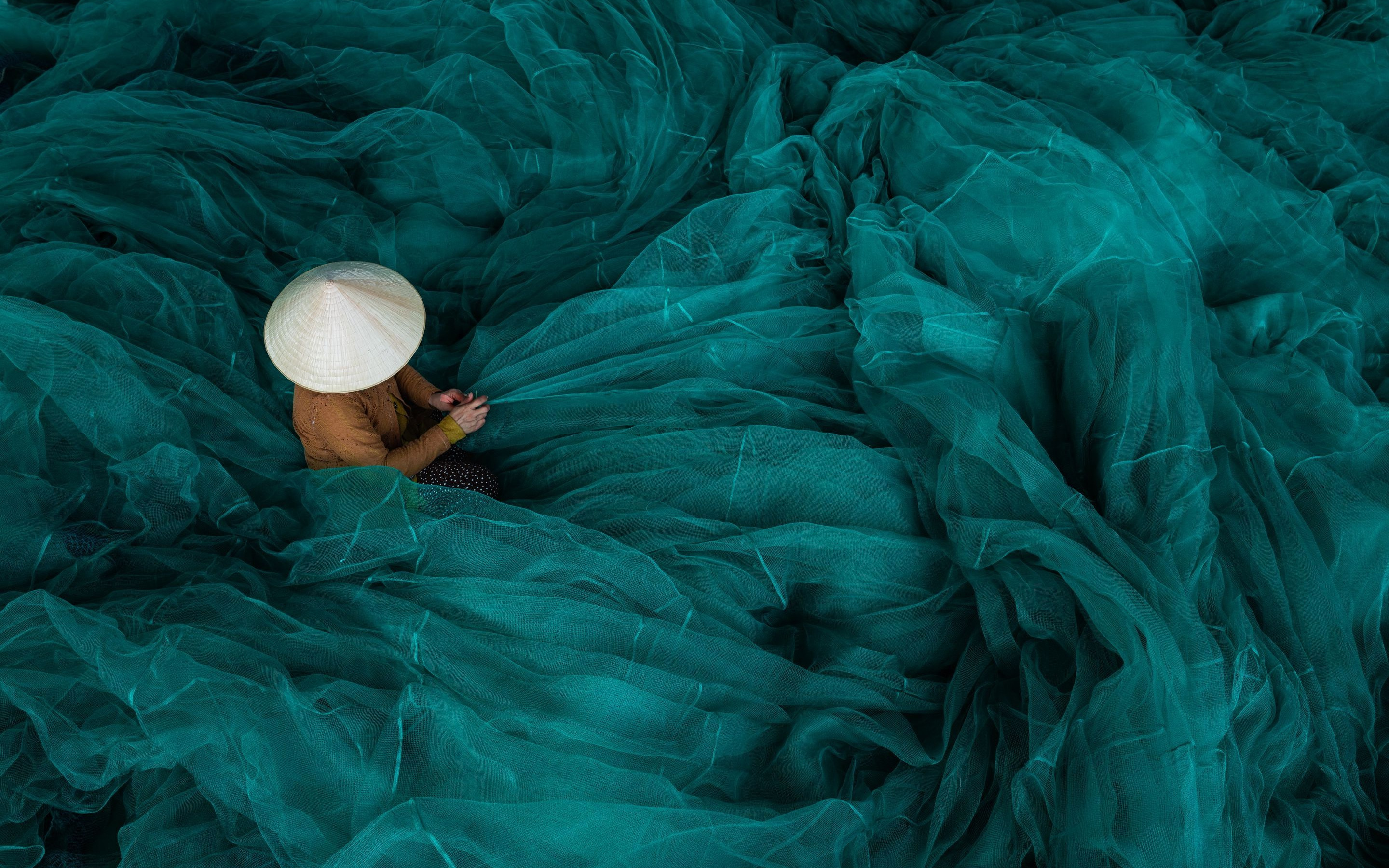 Description: A person sitting on a bed of green fabric with a white hat on their head and a white hat on their head.