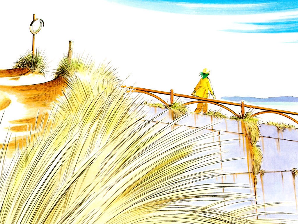 Description: A drawing of a person sitting on a bench on a bridge over a body of water with a clock on it.