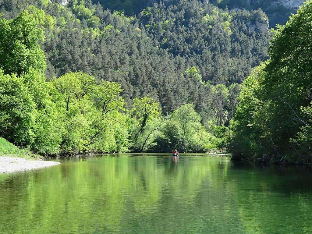 Description: A person in a boat on a river surrounded by trees and mountains in the background with a forest in the foreground.