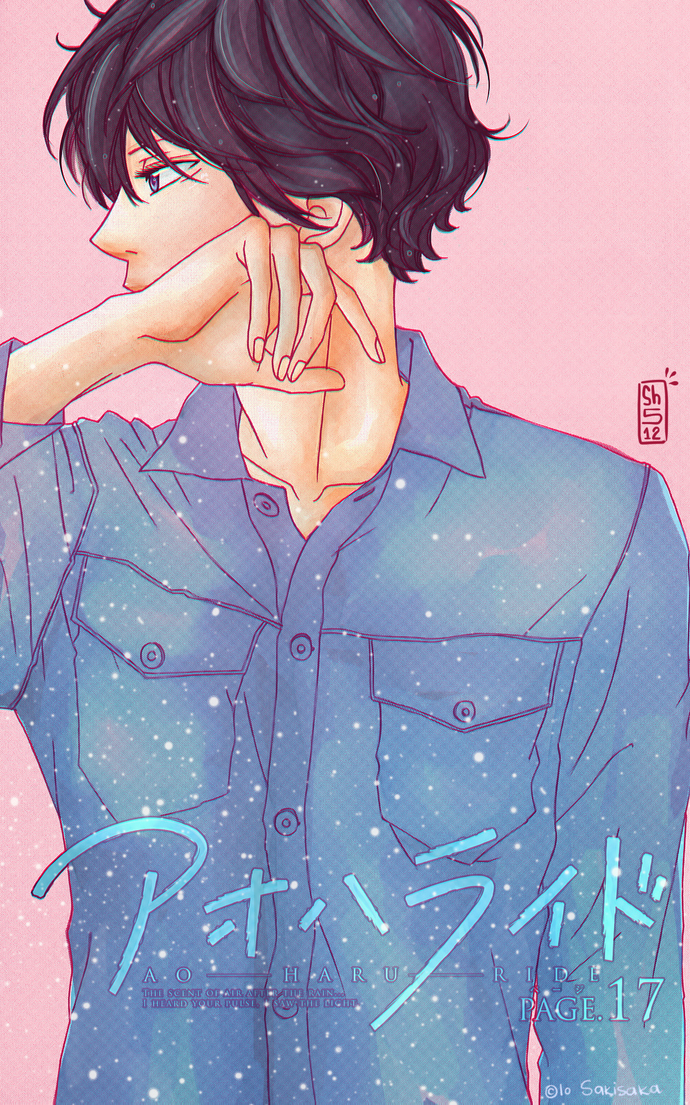 Description: A drawing of a person with a hand on their face and a pink background with a blue shirt on.