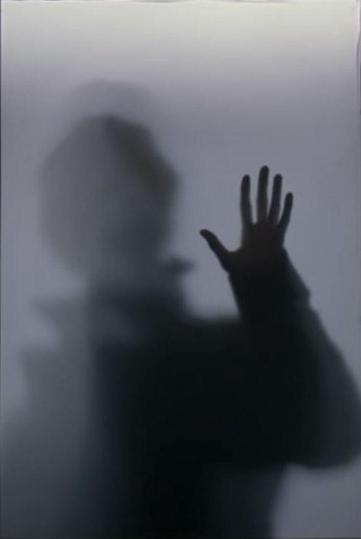 Description: A person with their hand up in the air with a shadow of their hand on a wall behind them.
