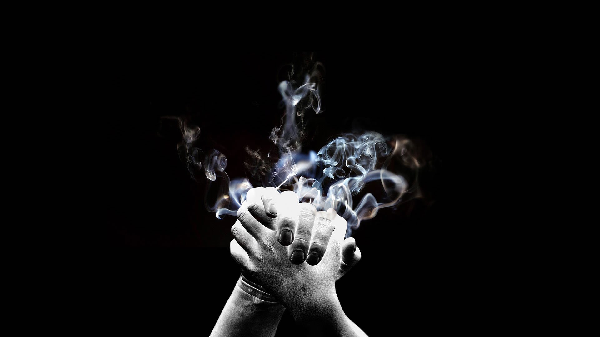Description: A person holding their hands up with smoke coming out of them on a black background with a black background.