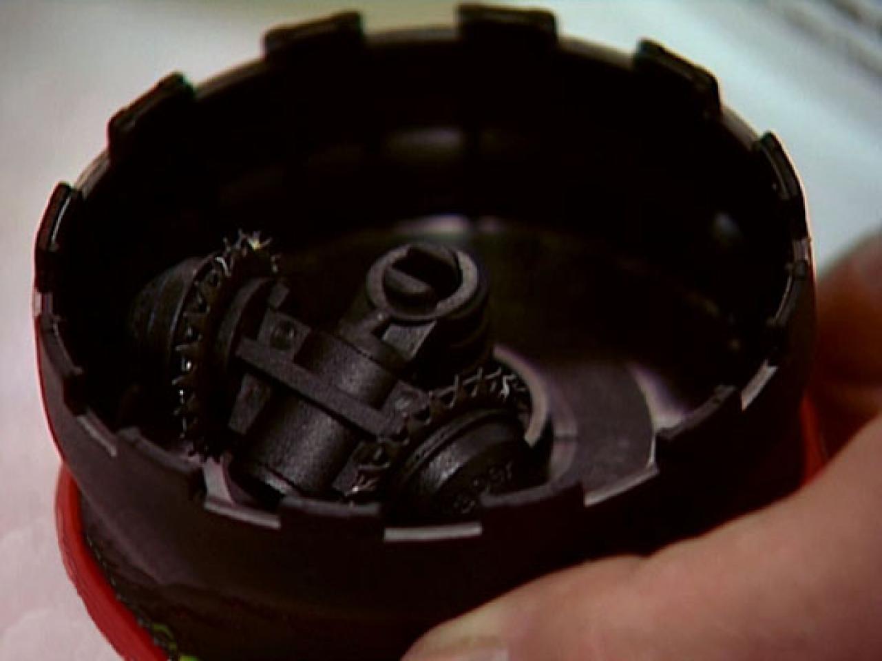 Description: A person holding a small black object in their hand with a red base and a black top with a black ring.