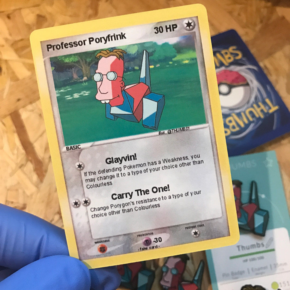 Description: A person holding a card with a picture of a cartoon character on it in front of a pile of other cards.