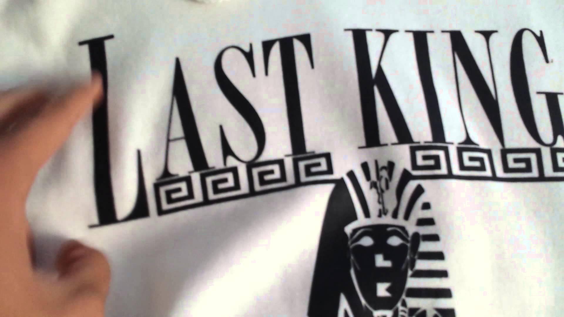 Description: A person is holding a cell phone up to their ear and a t - shirt with the words last king on it.