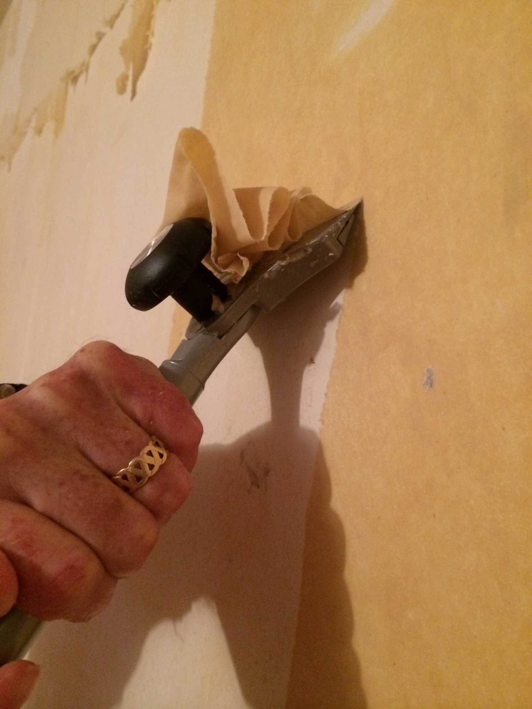 Description: A person holding a pair of scissors in their hand with a piece of paper on it and a piece of tape on the wall.