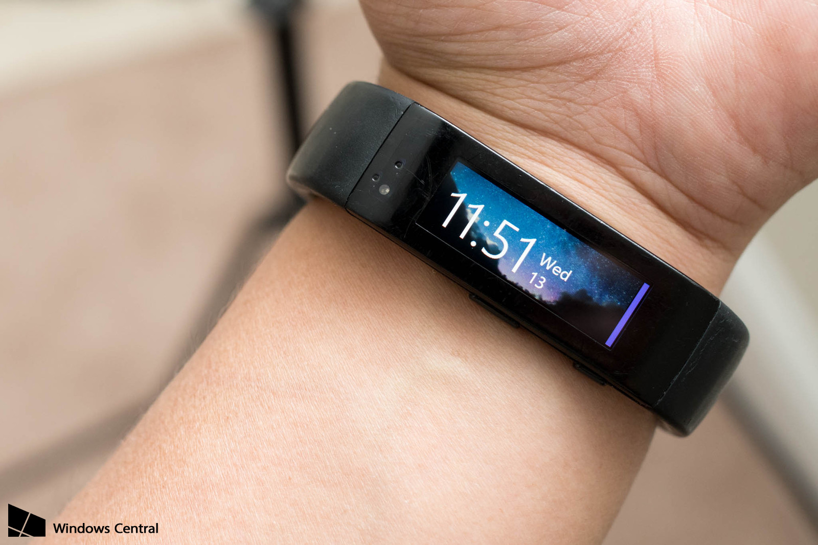 Description: A person is holding a smart watch on their wrist with a clock displayed on it's screen and a hand holding a cell phone.
