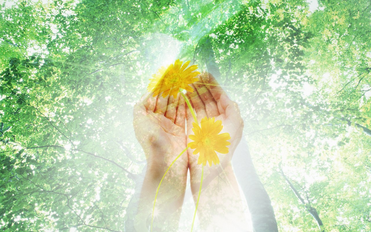 Description: A person holding a yellow flower in their hands with trees in the background and sunlight streaming through the leaves.