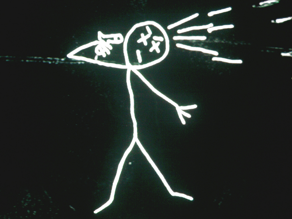 Description: A drawing of a person with a knife in his hand and a light shining on him.