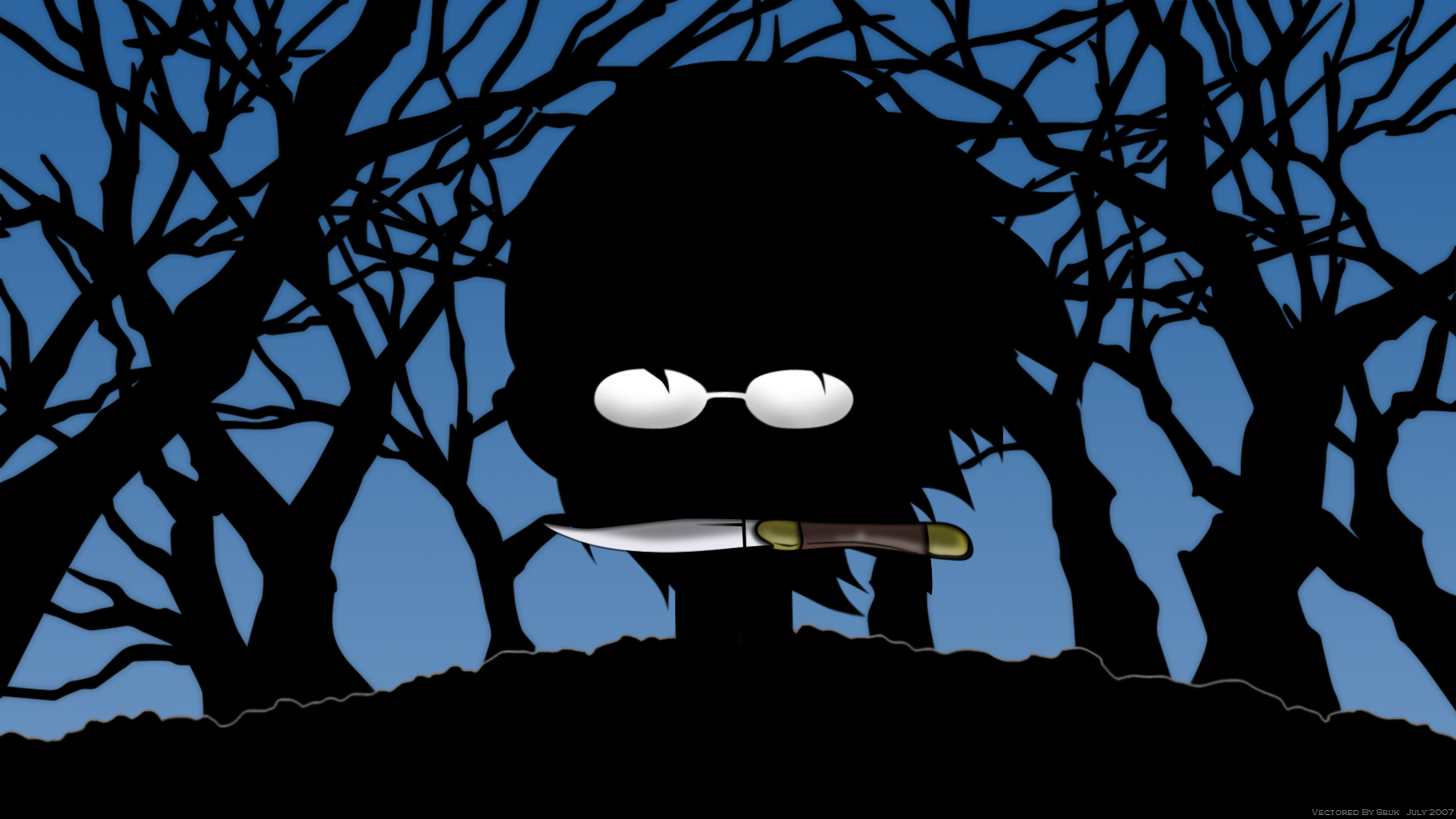 Description: A person with a knife in their hand standing in front of a tree with no leaves on it and a blue sky behind them.