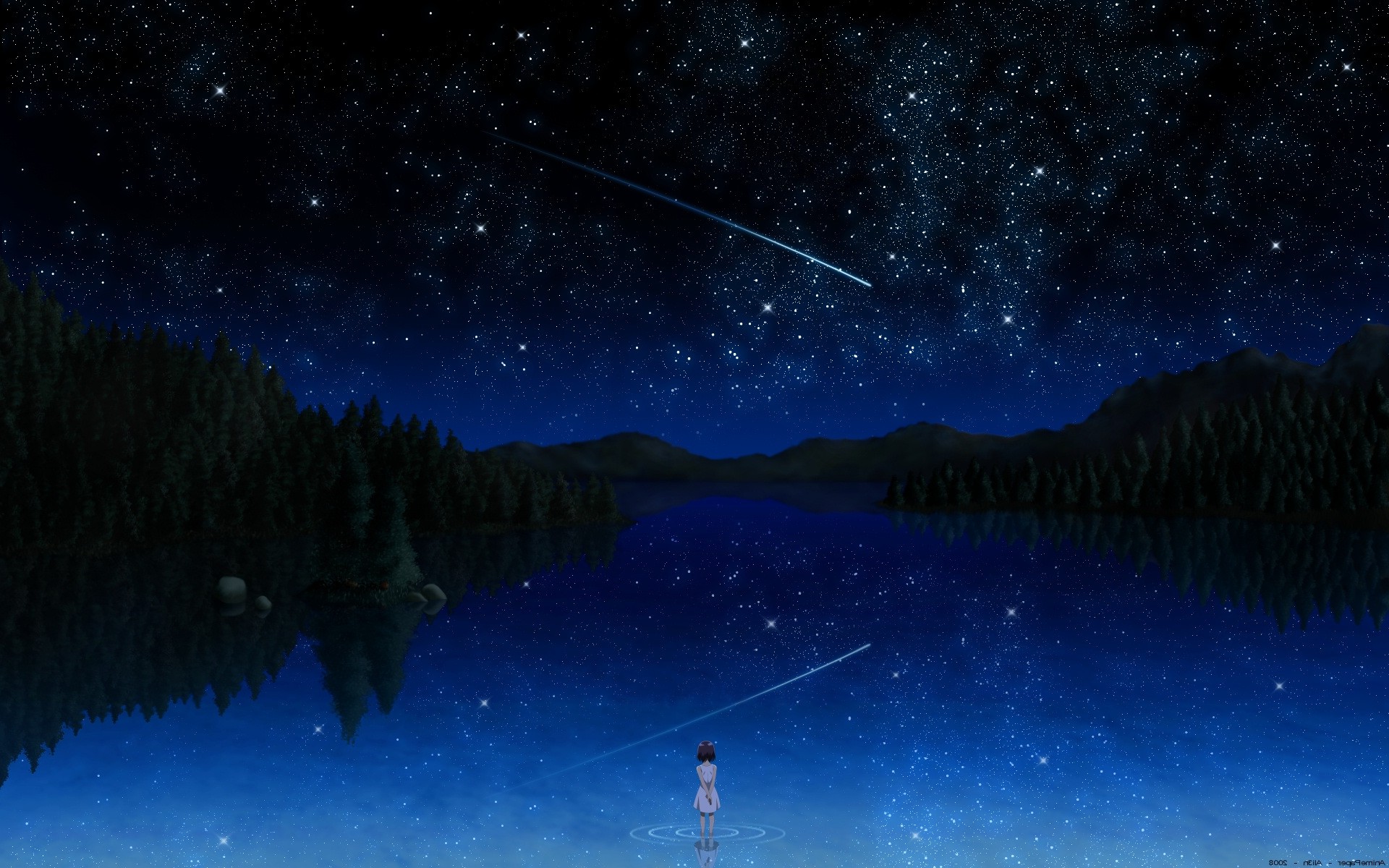 Description: A person standing in front of a lake under a night sky with stars and a shooting star above it.