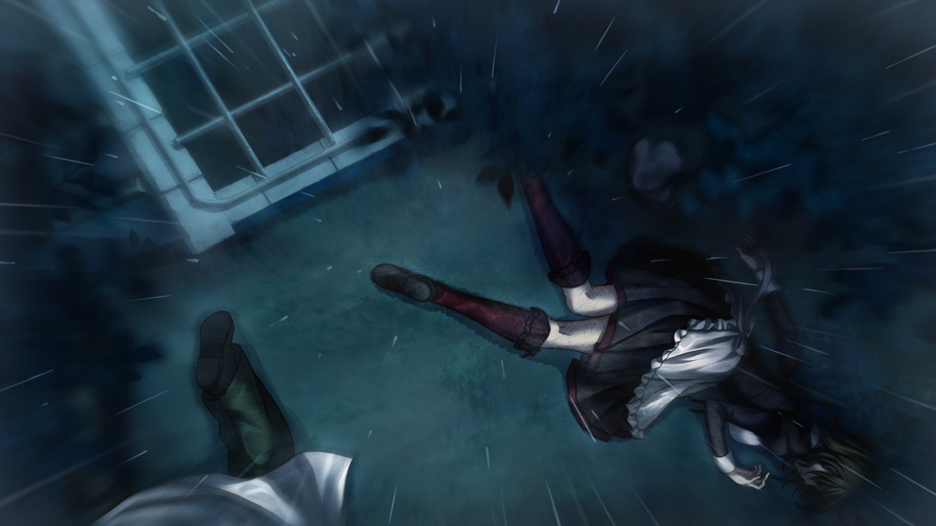 Description: A person laying on the ground in the rain with their feet up in the air and their feet down.