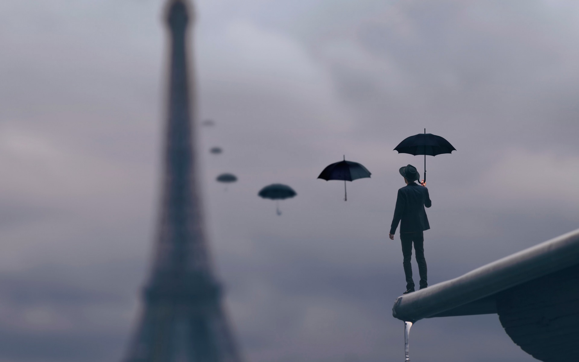 Description: A person standing on a ledge with an umbrella in front of a tower with several flying umbrellas in the air.
