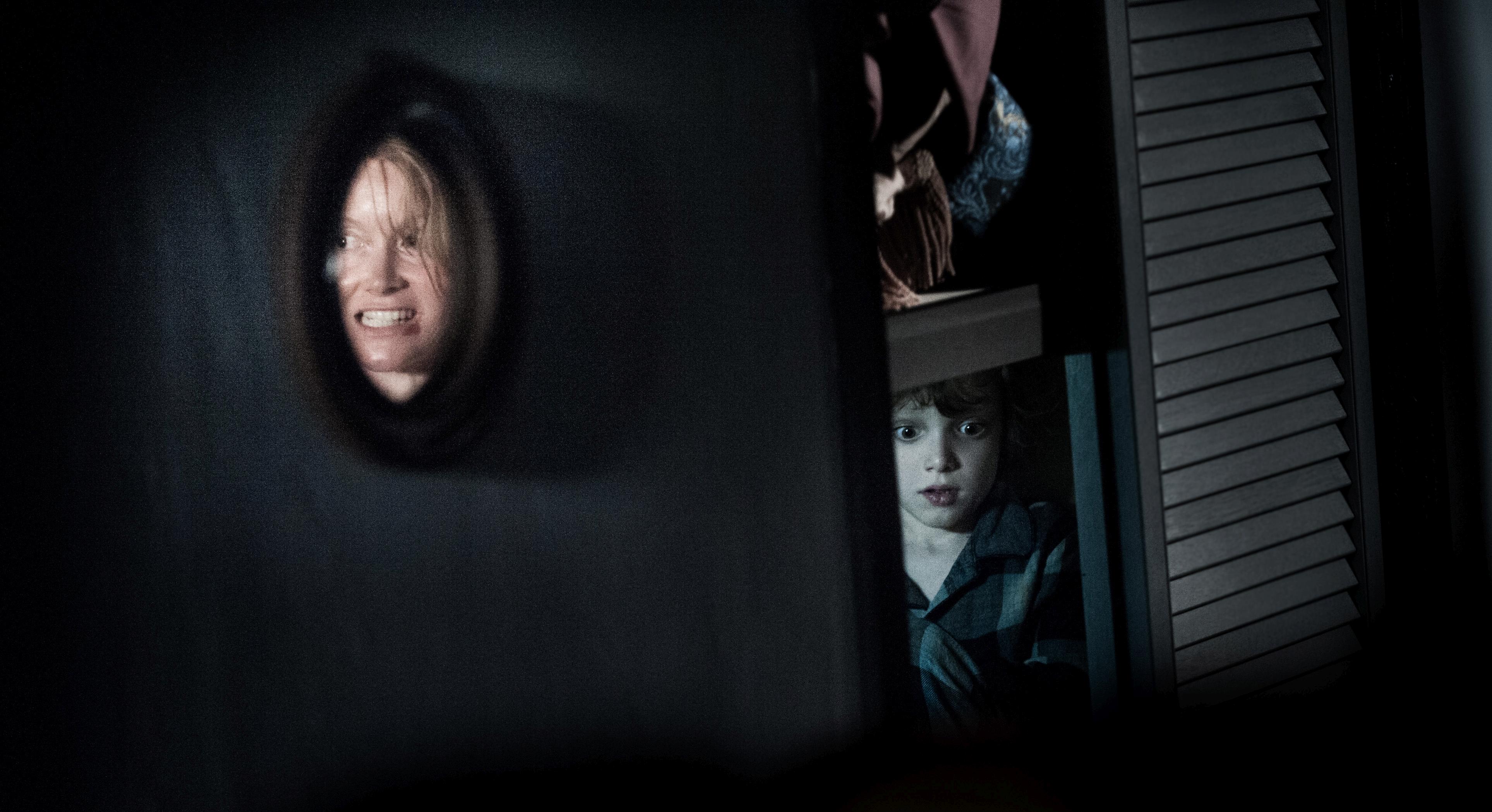 Description: A person looking at a mirror with a reflection of them in it and a person in the mirror behind it.