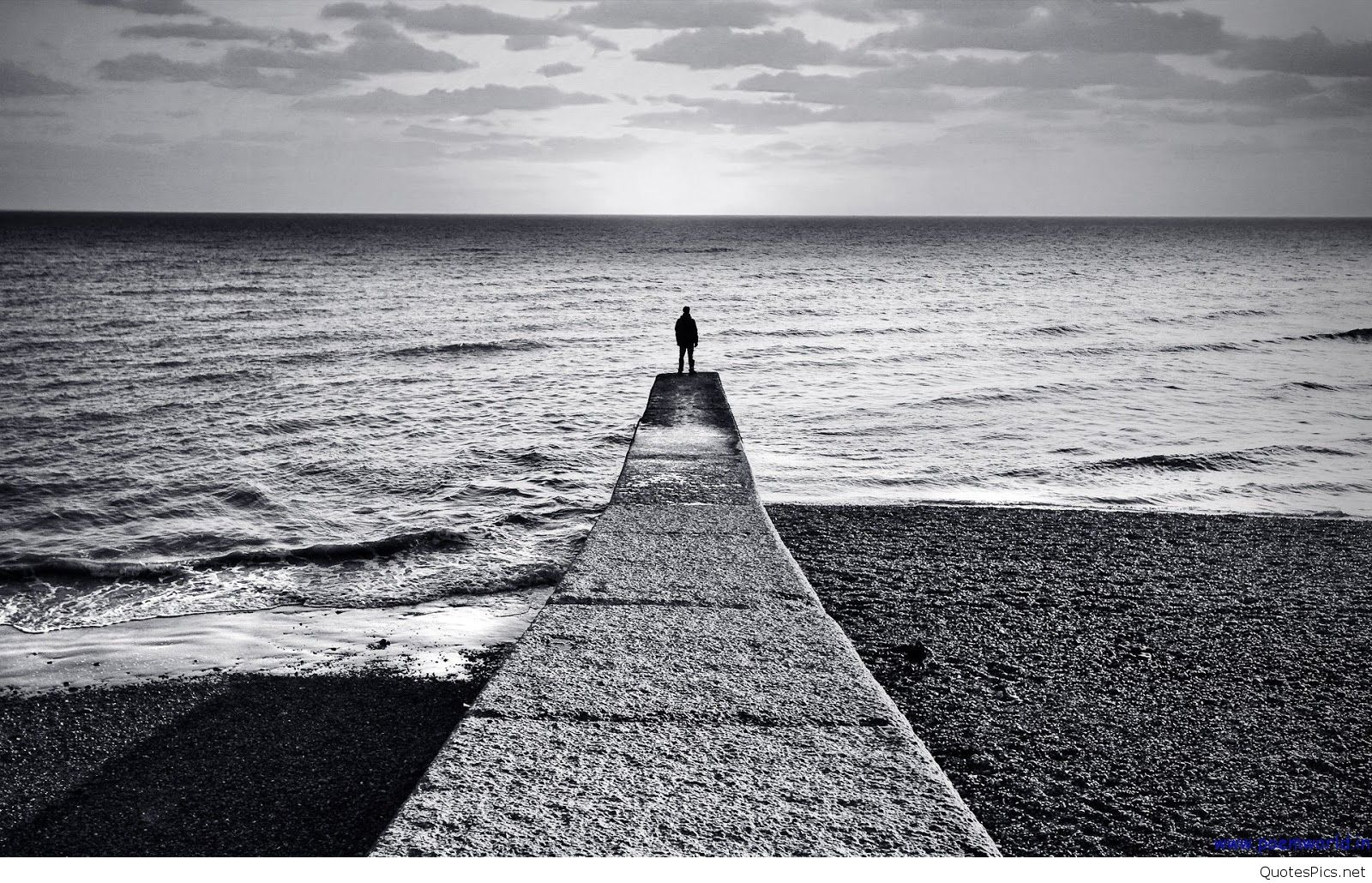 Description: A person standing on a pier looking out at the ocean in black and white photo with a sky background.