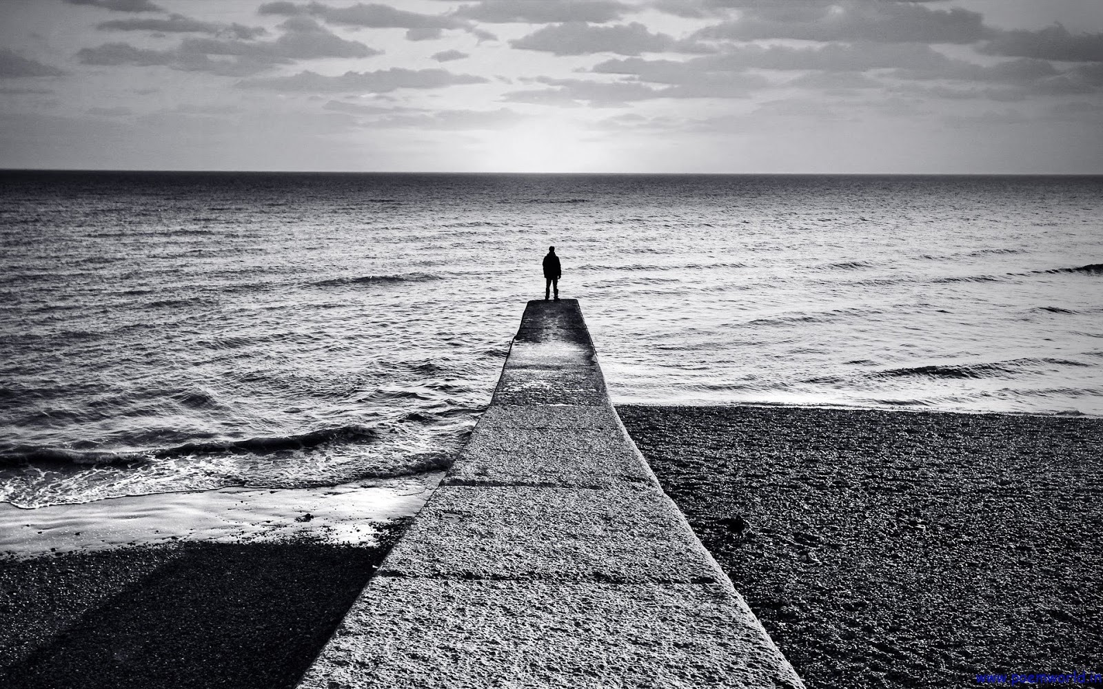 Description: A person standing on a pier looking out at the ocean in black and white photo with a sun shining through the clouds.