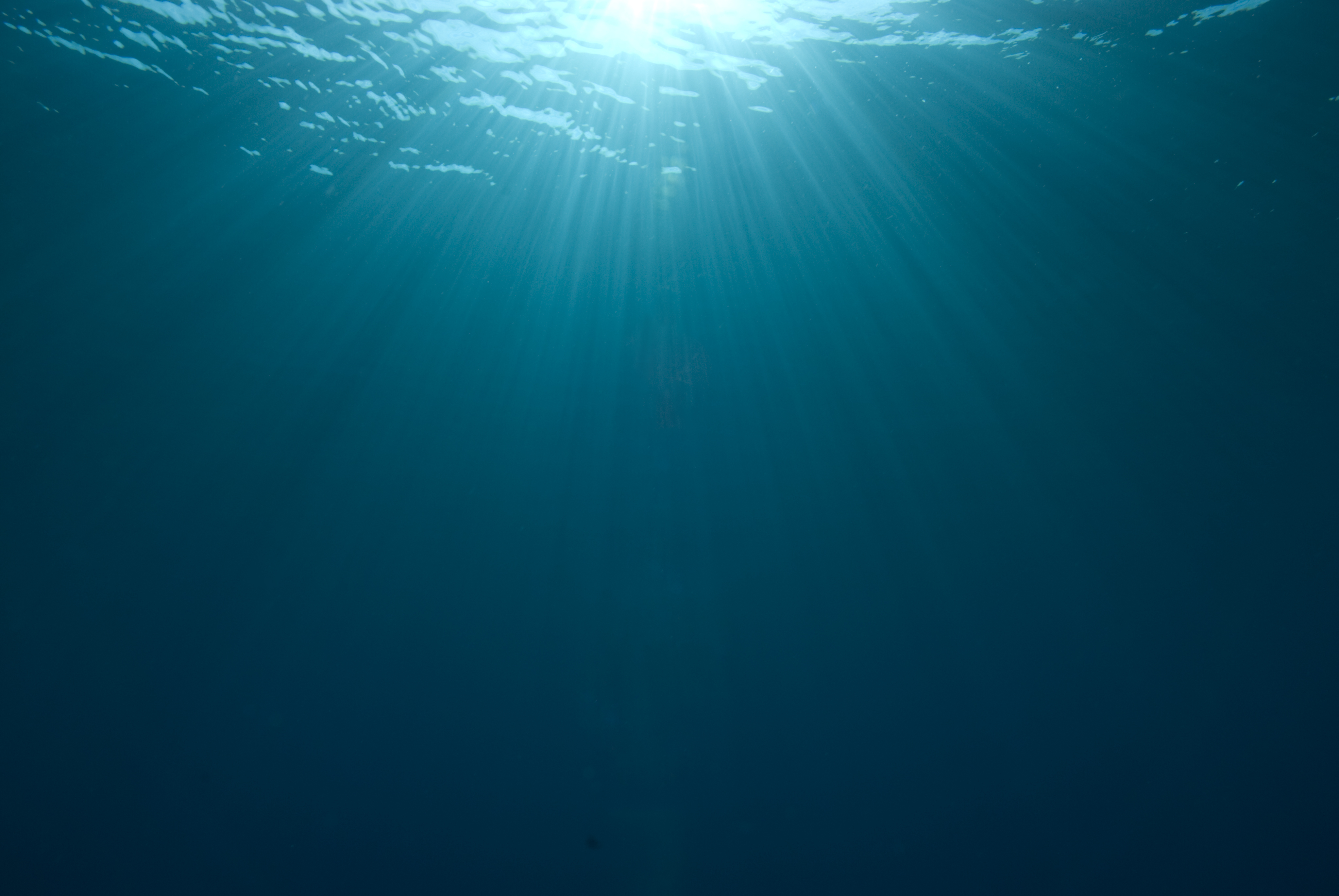 Description: A person riding a surfboard under water in the ocean under a bright sunbeam with a shadow of the ocean floor.