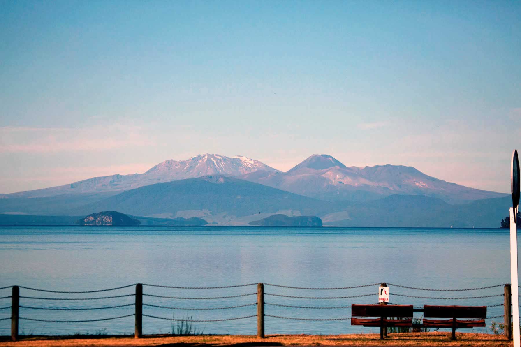Description: A person sitting on a bench in front of a lake with mountains in the background and a blue sky.