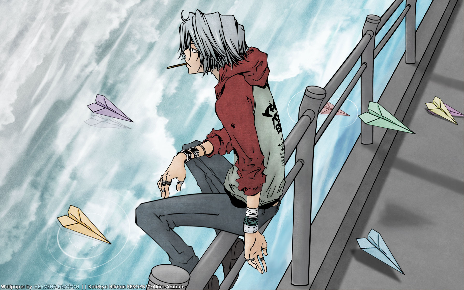 Description: A person sitting on a railing with paper airplanes flying around them and a man standing on the railing looking at the water.