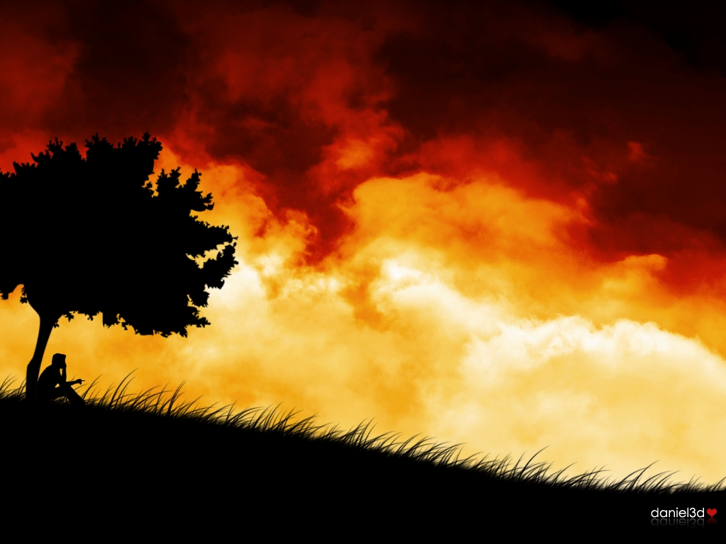 Description: A person sitting under a tree in the middle of a field with a red sky in the background and a red cloud in the sky.