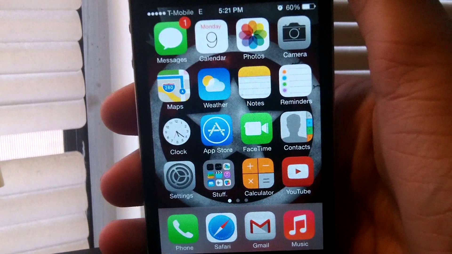 Description: A person holding a smart phone in their hand with icons on it and a window behind them with blinds.