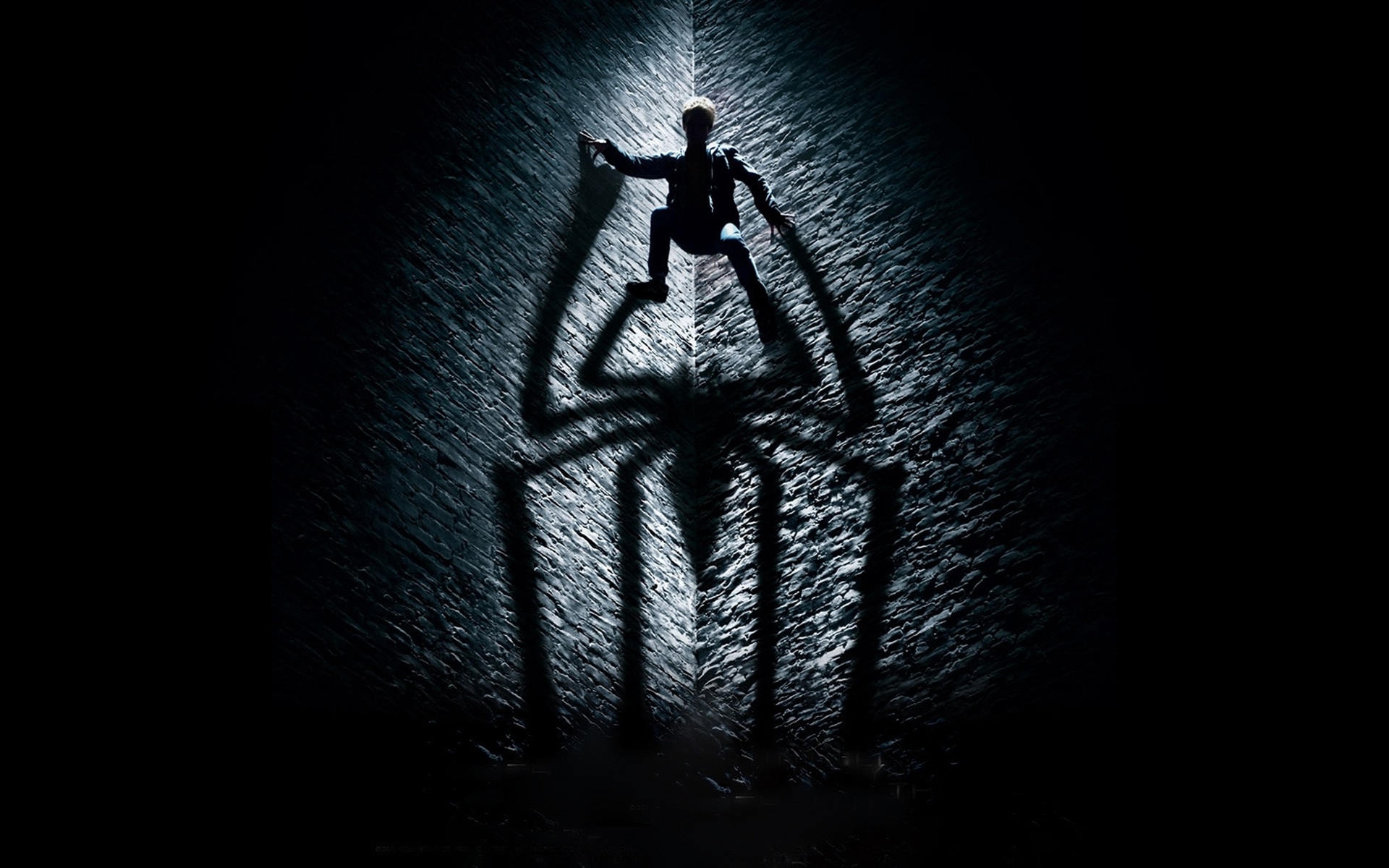 Description: A person standing on a spider man figure in the dark water of a river at night with a flashlight shining on the ground.