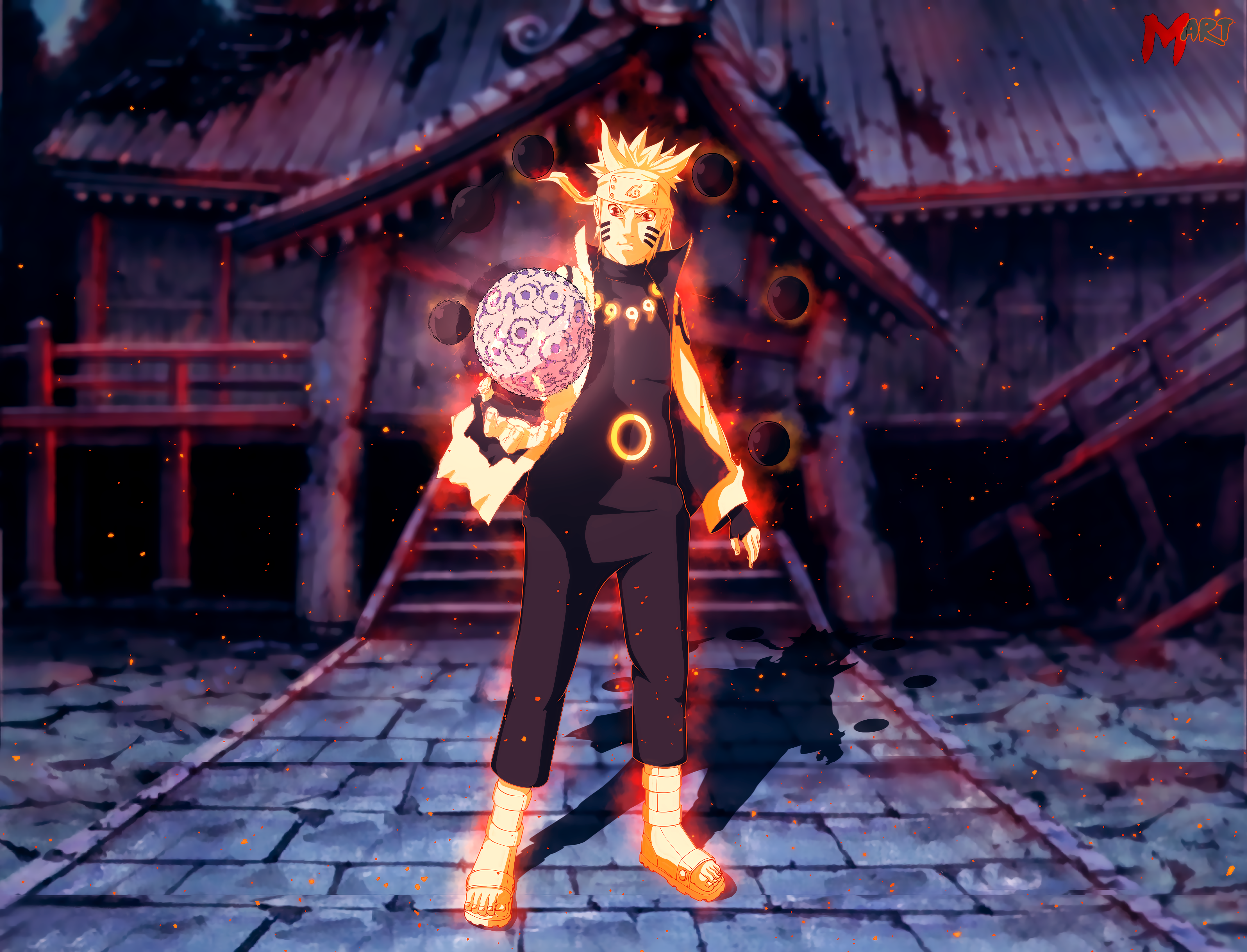 Description: A person standing in front of a building with a fireball in his hand and a fireball in his other hand.