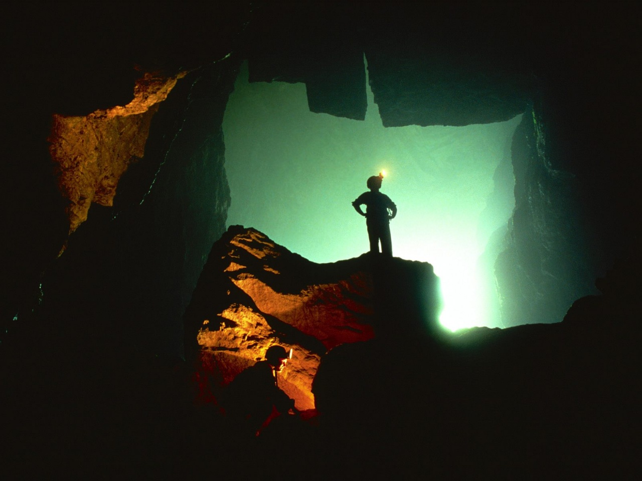 Description: A person standing on a rock in a cave with a light on their head and a flashlight in their hand.