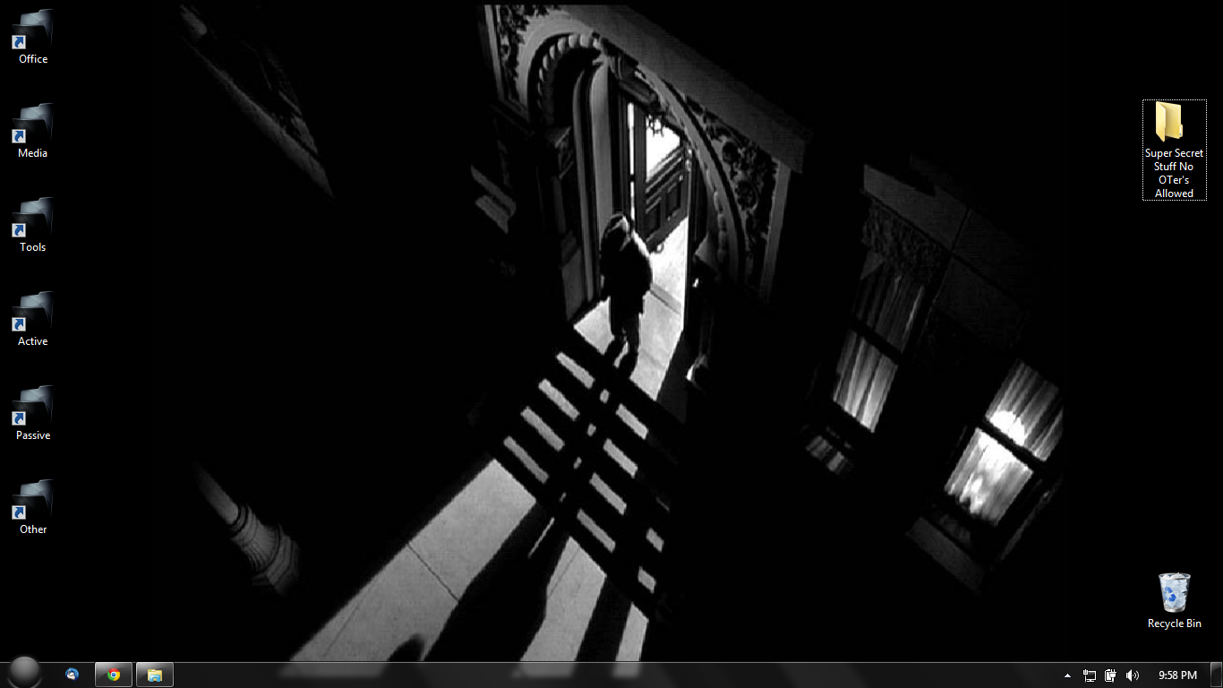 Description: A person standing in the shadows of a building at night with a laptop computer in front of them and a window.