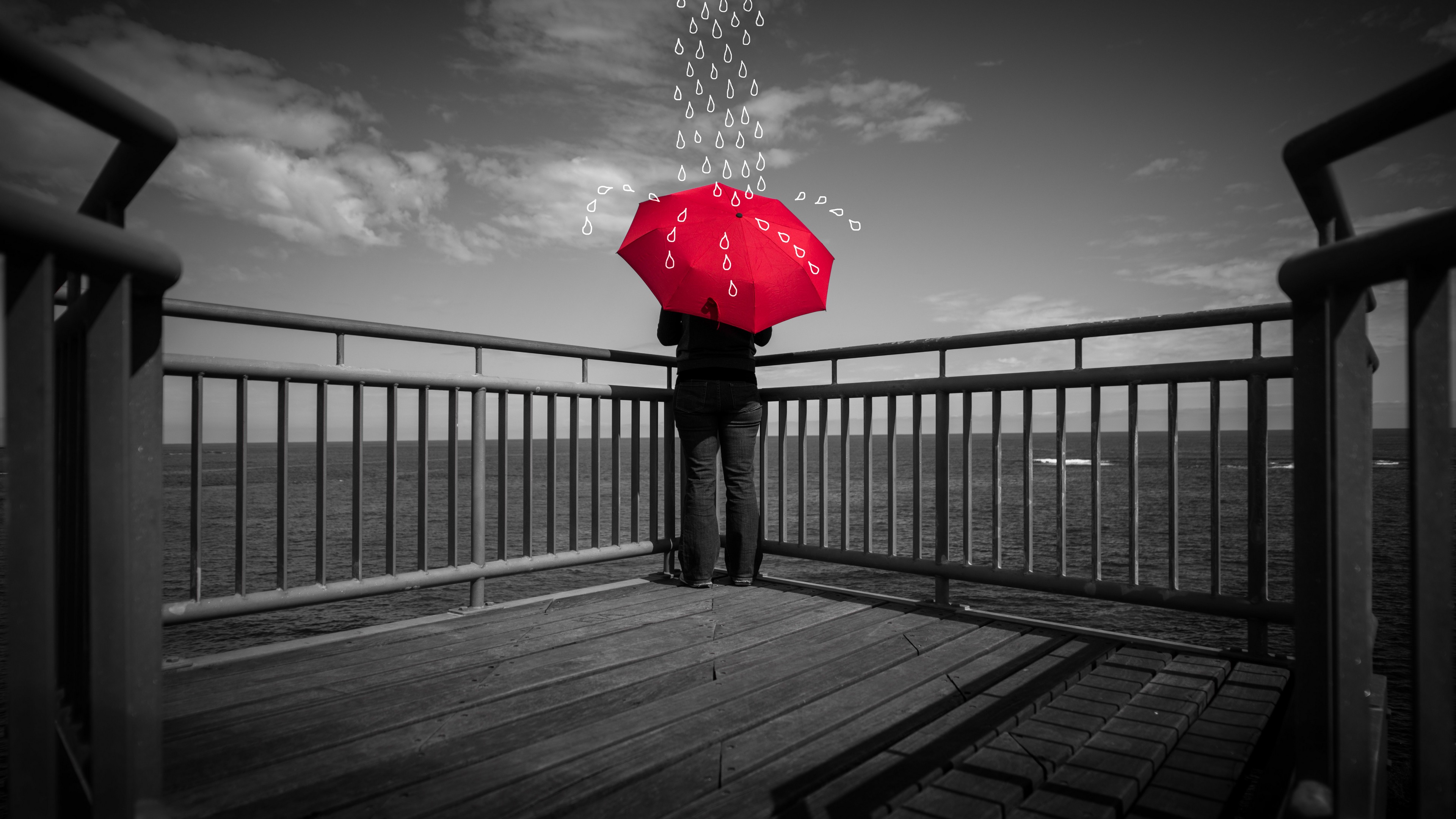 Description: A person standing on a deck with an umbrella over their head and a body of water in the background.