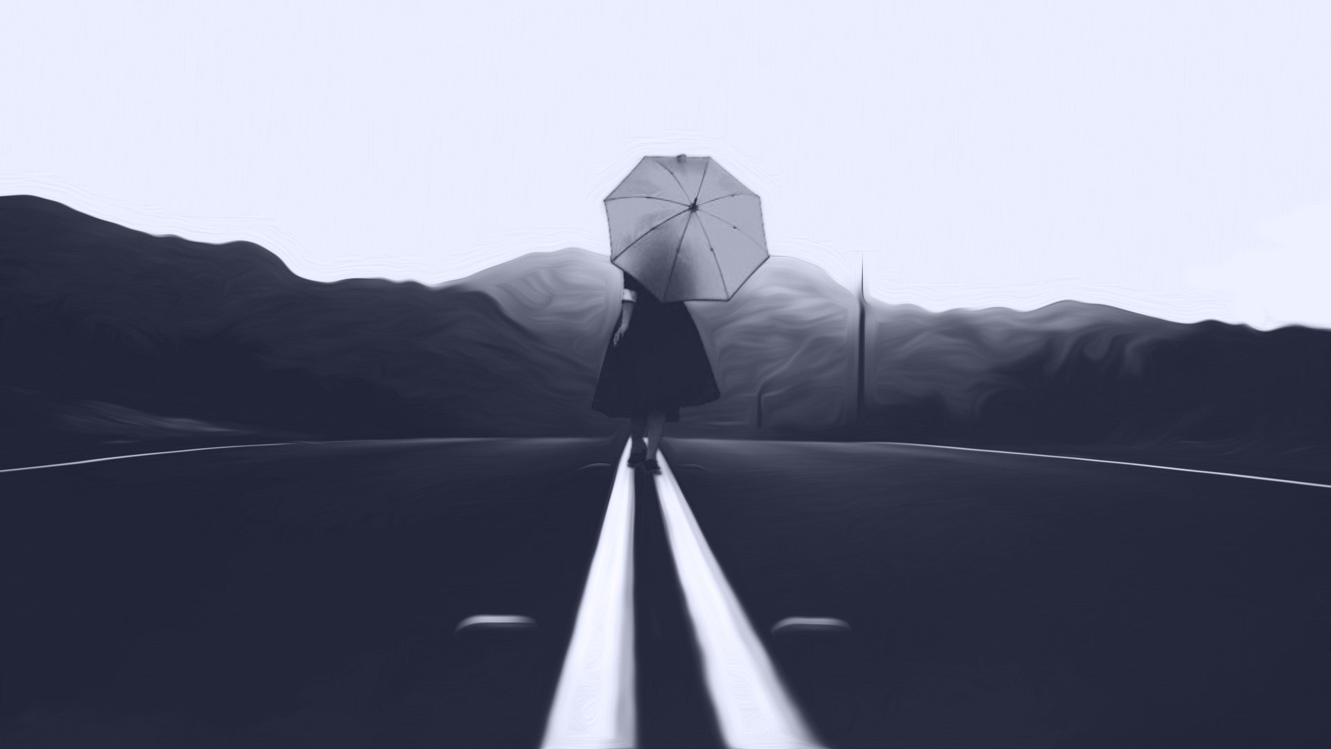 Description: A person with an umbrella walking down a road in the middle of nowhere.