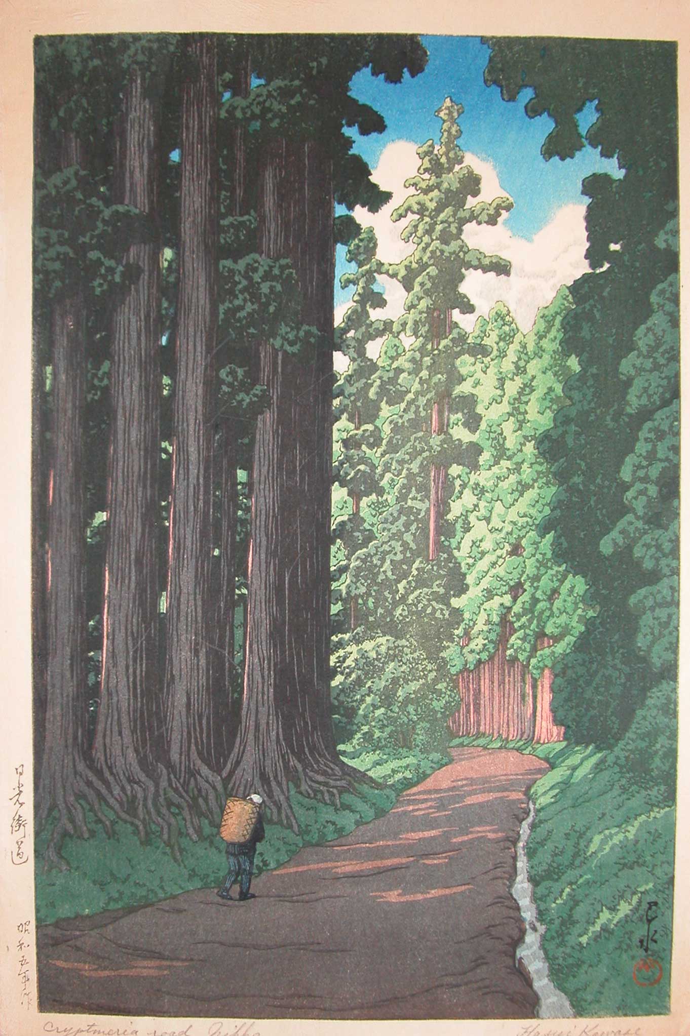 Description: A painting of a person walking down a road in a forest with tall trees on both sides of the road.