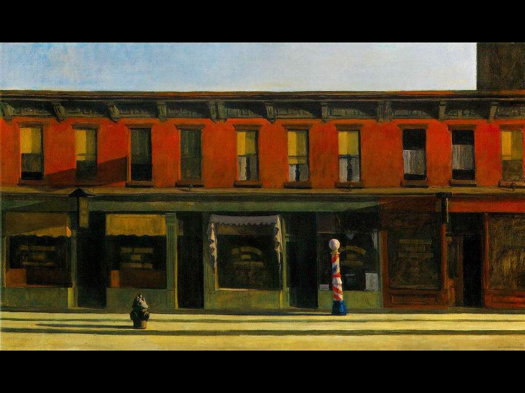 Description: A painting of a person walking down a street in front of a building with red shutters and a person walking past.