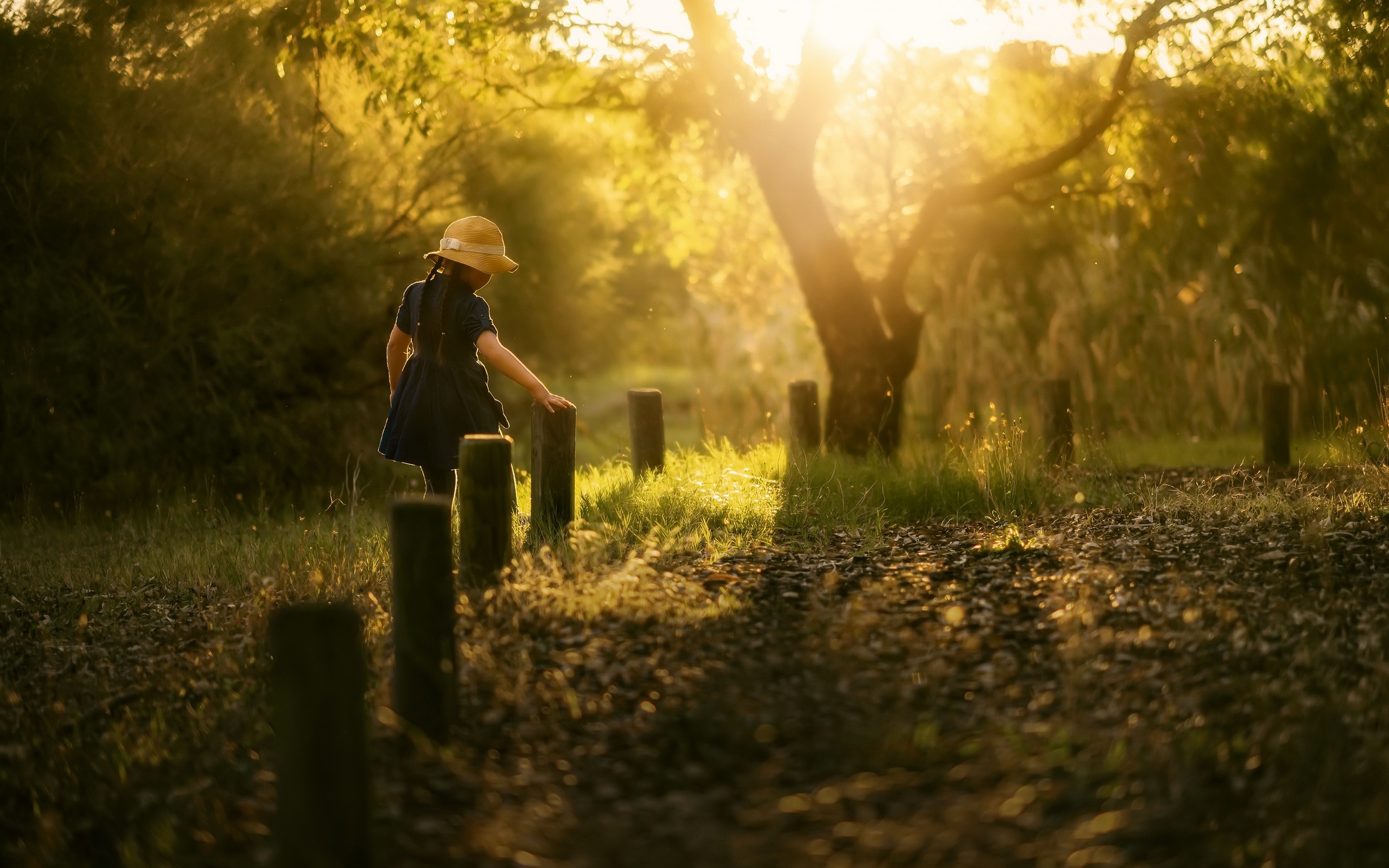 Description: A person walking down a path in the woods at sunset or sunrise time with a hat on and a backpack on.