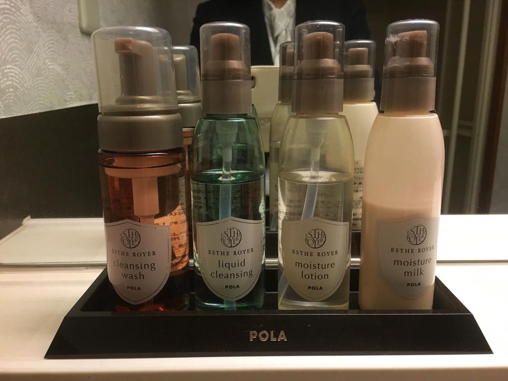 Description: A display of various types of personal care products on a counter top in a bathroom with a man in the background.