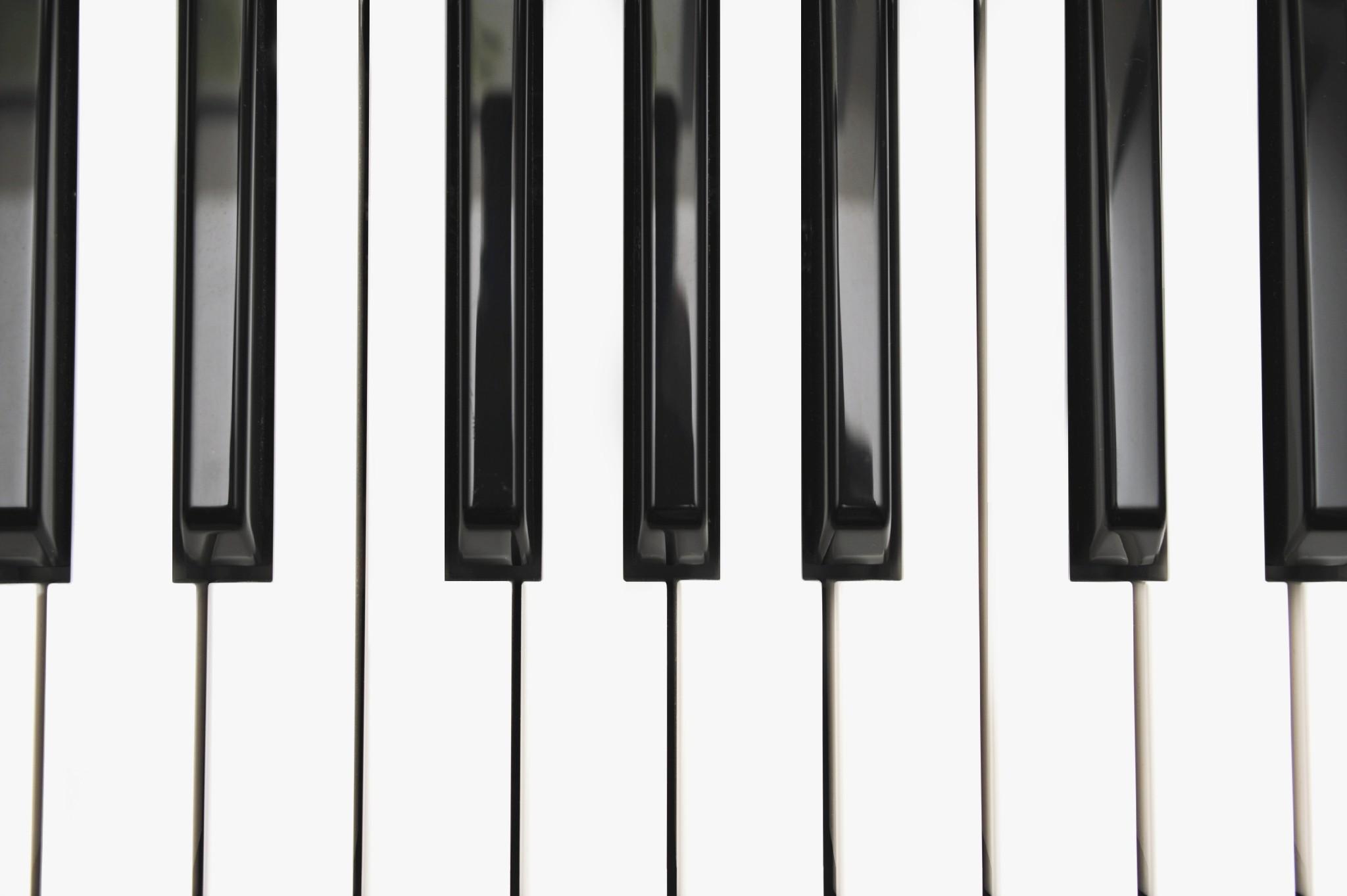 Description: A close up of a piano keyboard with many keys and black and white keys and a black case with a black top.