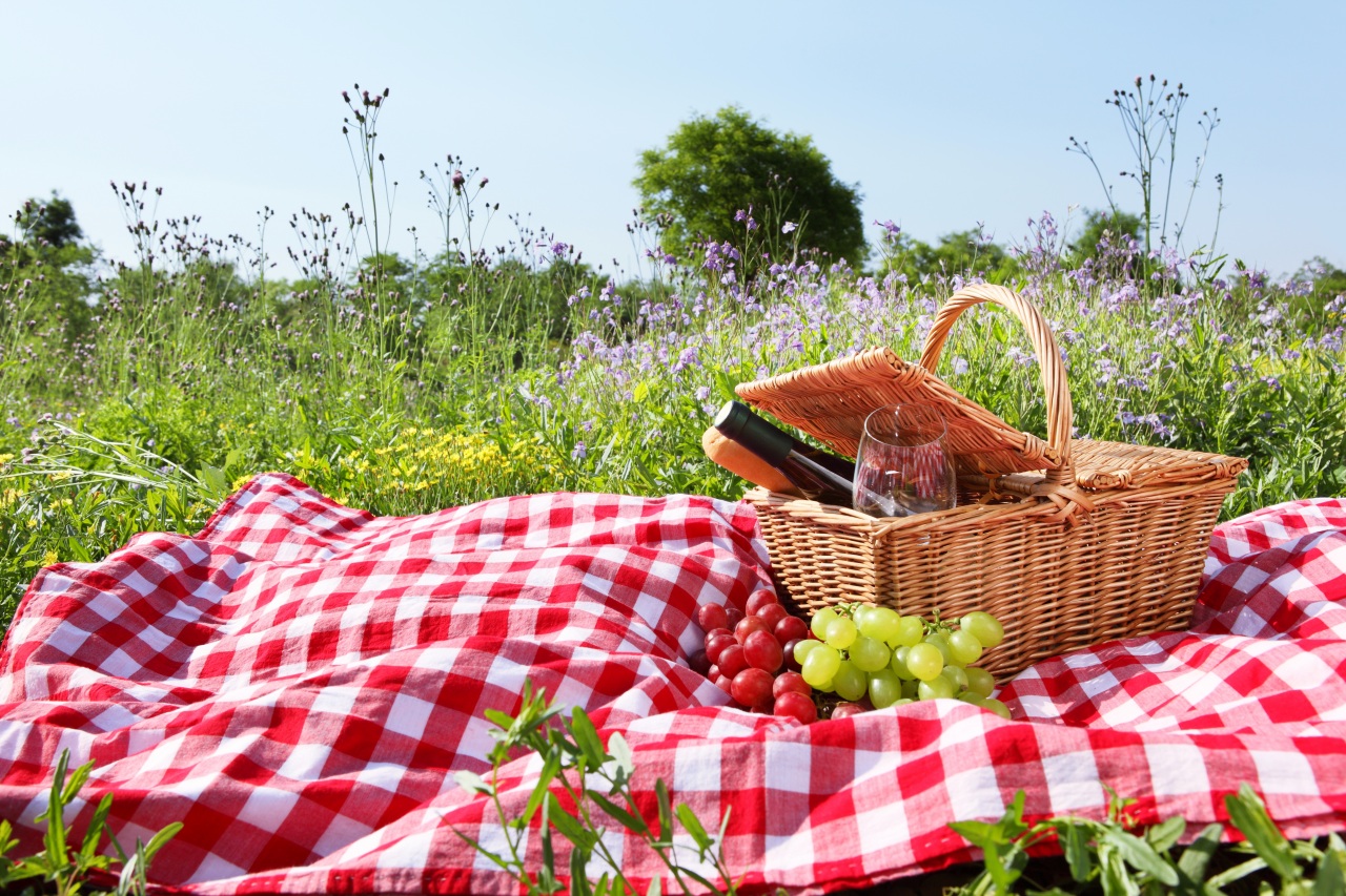 Description: A picnic blanket with a basket of grapes and a bottle of wine on it in a field of flowers.