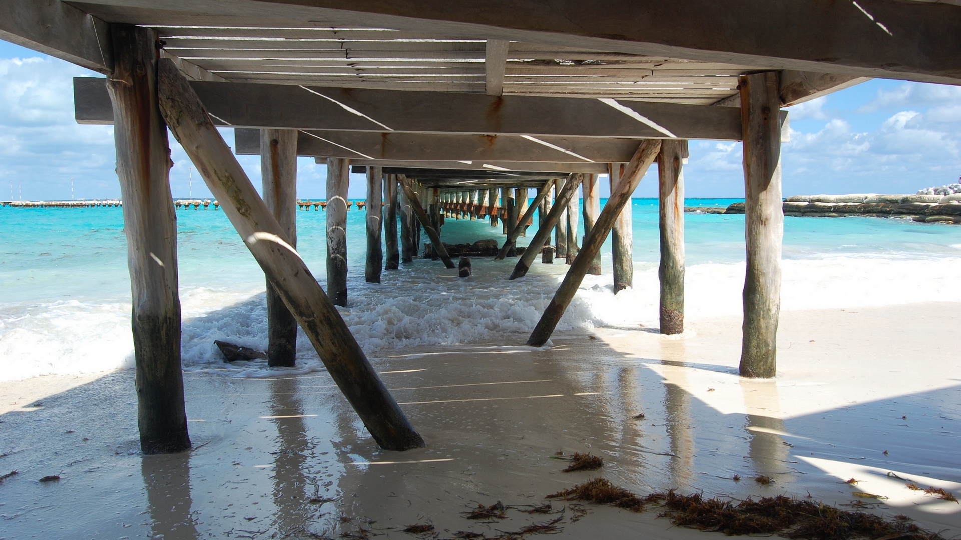 Description: A pier with a boat in the water and a beach underneath it with a few waves coming in and out of the water.