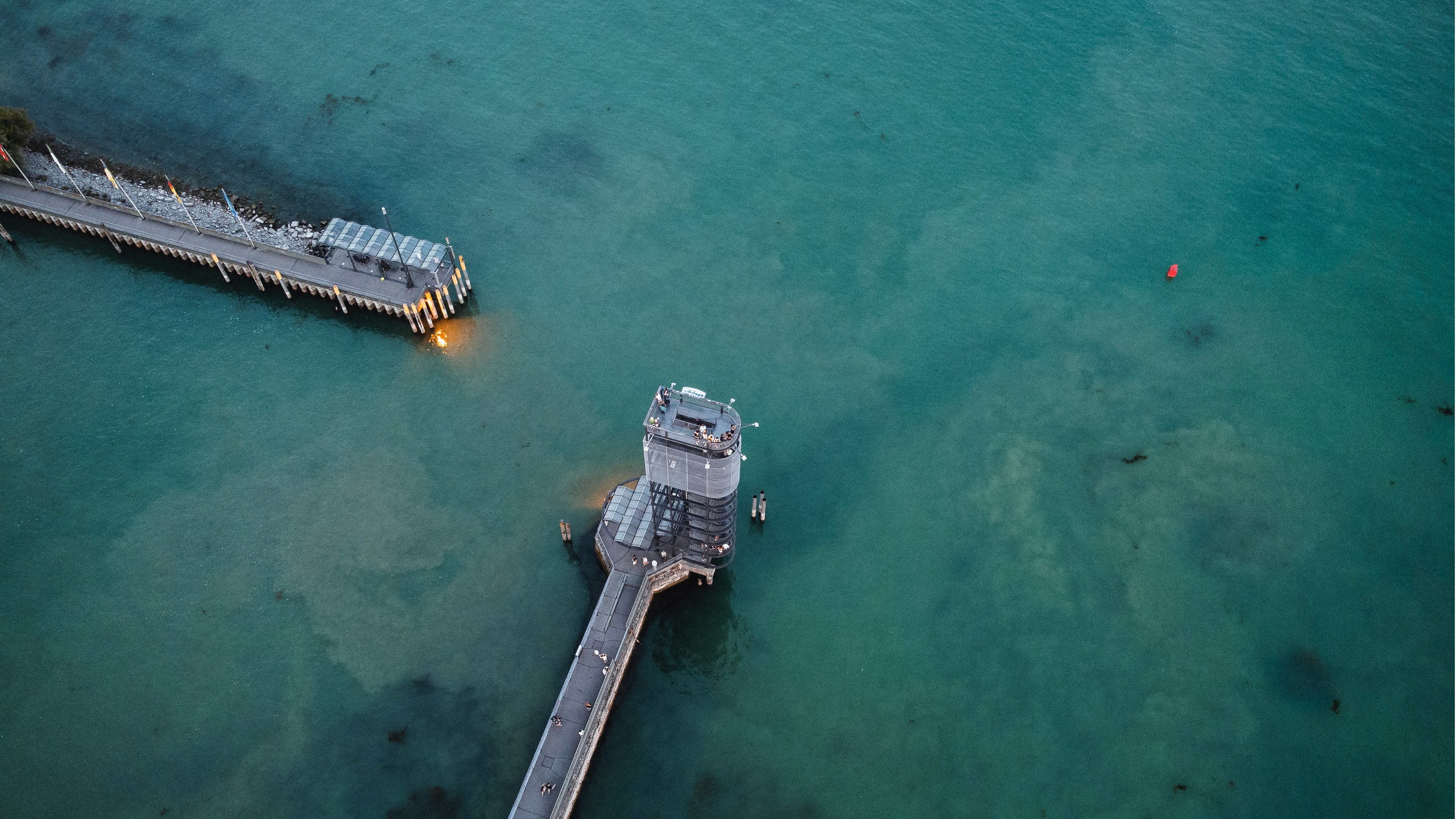Description: A pier with a boat and a pier with a light on it in the water near a pier with a light on it.