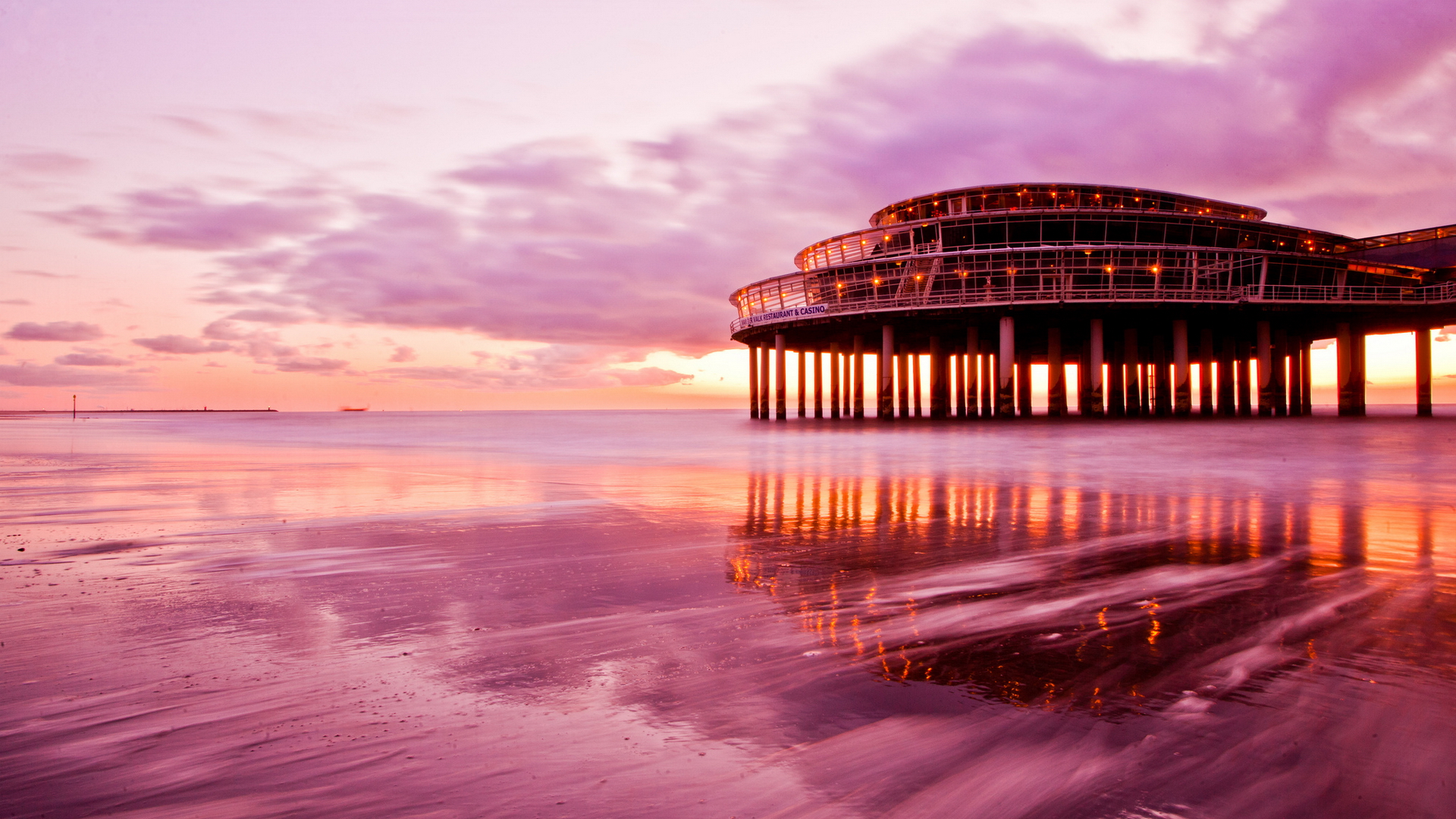 Description: A pier with a building on the top of it at sunset or dawn with a reflection of the water.